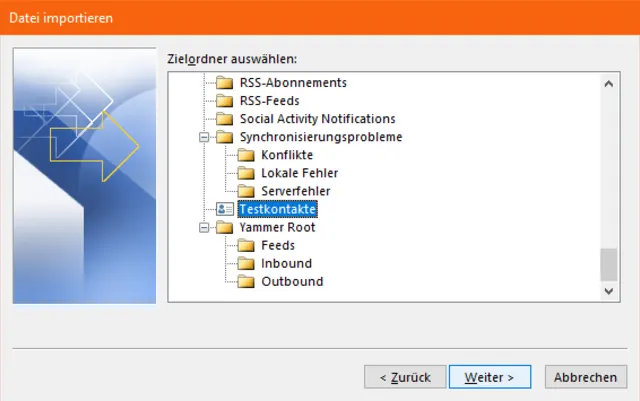 Der Zielordner heisst in unserem Beispiel «Testkontakte»