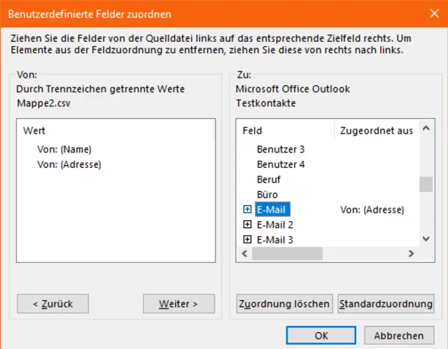Die Zuordnung der CSV-Felder zu den Outlook-Kontakt-Feldern erfolgt einfach per Maus bzw. Drag&Drop