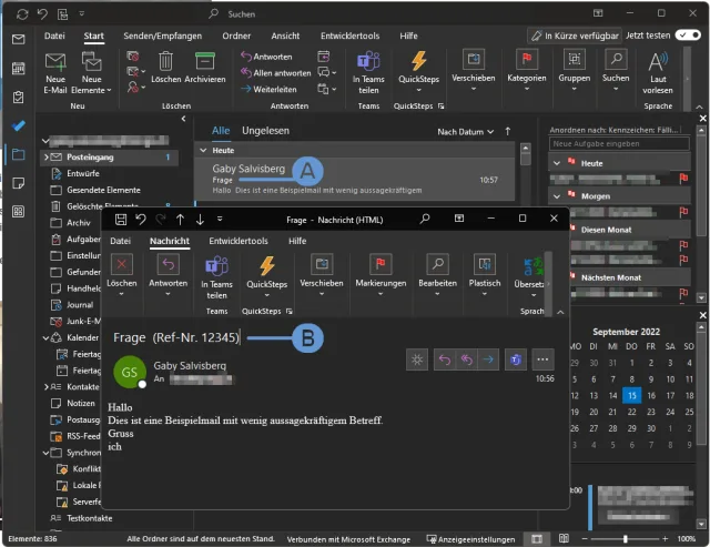Doppelklicken Sie eine Mail, um sie in einem separaten Fenster zu öffnen. Jetzt lässt sich der Betreff ganz einfach anklicken und ergänzen.