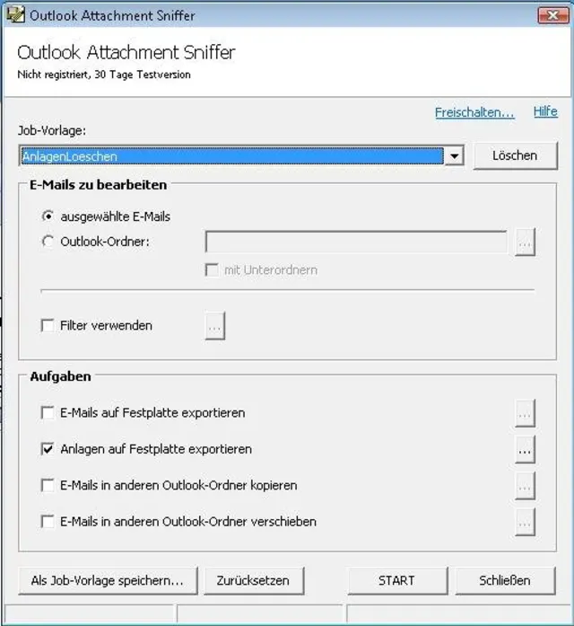 Wir empfehlen Ihnen, diese Einstellungen gleich als Job-Vorlage zu speichern; hierfür gibts eine separate Schaltfläche. Später können Sie die Job-Vorlage aus dem Ausklappmenü holen. Klicken Sie auf START, legt der Outlook Attachment Sniffer los.