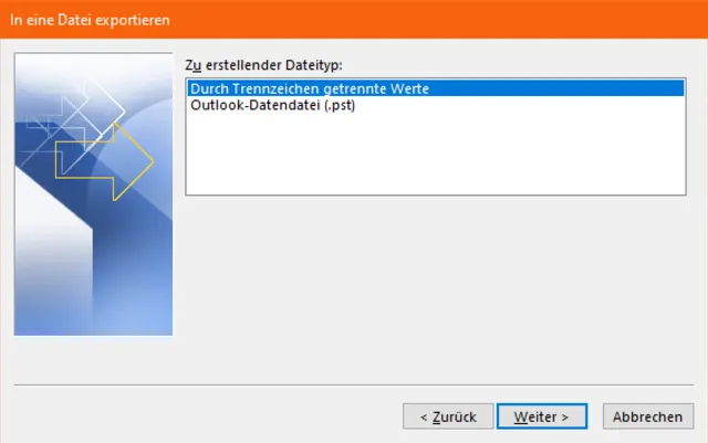 Quelle: PCtipp.chWählen Sie die Option In Datei exportieren und klicken Sie auf Weiter. Bei Zu erstellender Dateityp verwenden Sie Durch Trennzeichen getrennte Werte. Klicken Sie auf Weiter.