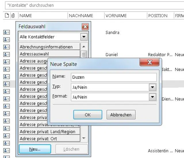 - Variante 1: neues Feld. Entweder erstellen Sie ein eigenes benutzerdefiniertes Ja/Nein-Feld namens «Duzen». Das lässt sich später in Outlook in der Listenansicht mit einem einfachen Klick umschalten. Das ist sehr praktisch, denn damit geht das Zuordnen von «Du» oder «Sie» sehr schnell vonstatten. Diese Variante hat aber einen grossen Haken: Das Feld wird ausschliesslich in der Outlook-Liste angezeigt oder wenn Sie die Liste direkt ab Outlook ausdrucken. Sie können dieses eigene Feld aber nicht einfach z.B. in Word-Serienbriefen benutzen oder in eine Excel-Liste exportieren. Für diesen Zweck wäre Variante 2 besser.