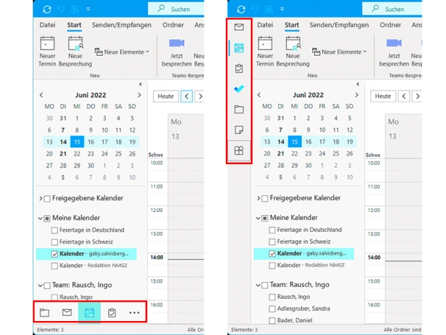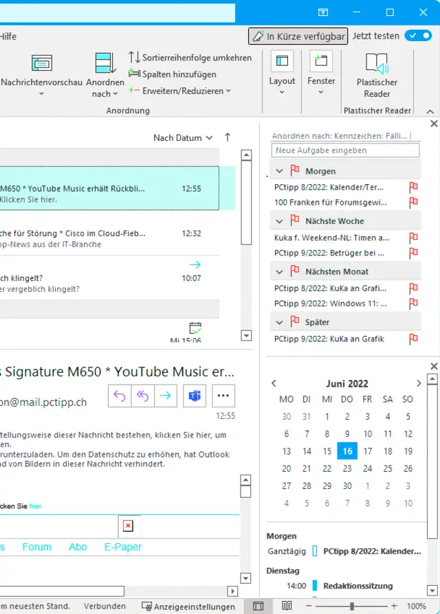 Je nach Outlook-Version befinden sich in der linken Spalte die Favoriten-Symbole ganz unten oder ganz links. Per Klick auf diese öffnen Sie die Outlook-Ordneransicht bzw. die Mail-, Aufgaben- oder Kalenderansicht, Bild 1. Für den Artikel schalte ich via In Kürze verfügbar und Jetzt testen auf die modernere Ansicht um, die diese Symbole ganz an den linken Outlook-Rand verfrachtet.