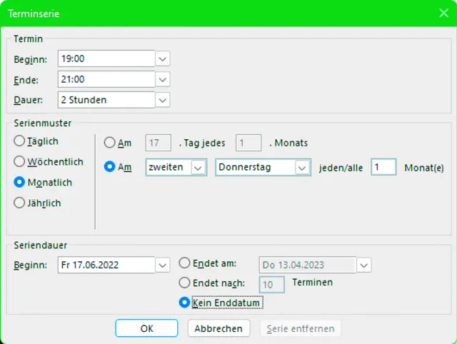 Für den monatlich stattfindenden Stammtisch oder eine wöchentliche Sitzung gibts die Terminserie, die Sie beim Rechtsklick in Ihren Kalender direkt aufrufen. Sollten Sie bloss zur Option Neuer Termin gegriffen haben: kein Problem, denn in den Einstellungen eines Einzeltermins finden Sie ebenfalls den Serientyp. Der bietet sehr flexible Planungsmöglichkeiten. Findet ein Termin nur alle zwei Monate statt? Oder immer am zweiten Donnerstagabend jedes Kalendermonats? All dies verewigen Sie leicht in der Terminserie, Bild 6. Sofern die Anzahl Wiederholungen nicht bekannt ist, aktivieren Sie hier die Option Kein Enddatum.