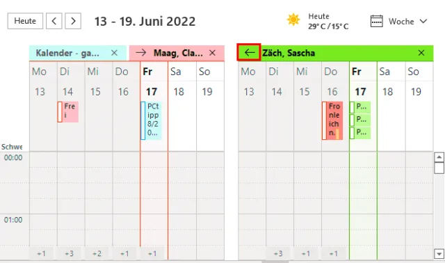 Bild 8: Die Kalender mehrerer Personen lassen sich in einem einzigen Kalender überlappend darstellen