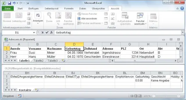 Öffnen Sie die so erstellte Musterdatei in Excel. Anhand Ihres Beispielkontakts können Sie nun sehen, wie die Spalten heissen. Öffnen Sie jetzt nebenher die Excel-Tabelle mit den zu importierenden Adressen (oder eine Kopie davon). Gehen Sie via Ansicht zu Alle anordnen/Horizontal, damit Excel beide Dateien im gleichen Fenster anzeigt.