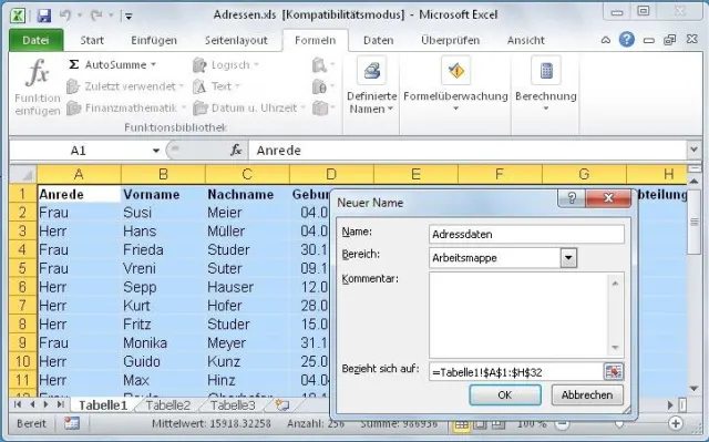 Quelle: PCtipp.chWichtig: Damit Outlook später die Daten aus der *.xls-Datei importieren kann, muss der Datenbereich einen Namen tragen. Öffnen Sie die vorbereitete Adressliste in Excel. Markieren Sie den Bereich, in welchem die Daten stehen, z.B. den Zellbereich A1 bis H32. Wechseln Sie in den Reiter Formeln und öffnen den Namensmanager. Gehen Sie darin zu Neu und geben dem Bereich einen Namen, wie zum Beispiel «Adressdaten». Der vorhin markierte Bereich wird automatisch übernommen. Gehen Sie zu OK und Schliessen, speichern Sie die Datei und schliessen Sie Excel.