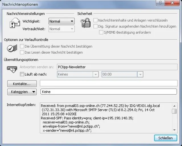 Lösung: Hier haben wir einen weiteren typischen Fall von Feature-Versteckis durch Microsoft. Der E-Mail-Header enthält quasi das Logbuch der Reise einer E-Mail; dies lückenlos ab dem Mailprogramm des Verfassers bis in Ihren Posteingang.
