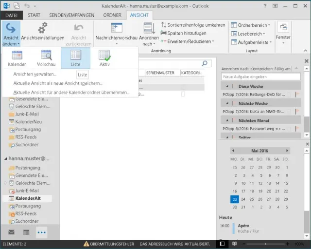 Aber es gibt einen einfachen Trick hierfür. Wenn Sie den Kalender geöffnet haben, wechseln Sie oben einmal zu Ansicht. Bei Ansicht ändern schnappen Sie sich Liste. Schon sehen Sie alle Kalendereinträge auf einen Schlag vor sich, schön untereinander als Liste dargestellt.