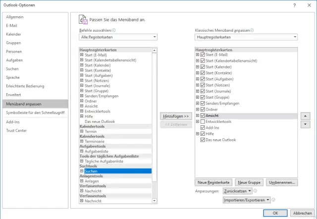 In der linken Spalte wählen Sie oben bei Befehle auswählen den Eintrag Alle Registerkarten. Scrollen Sie zu Suchtools und klicken Sie jenes an. In der rechten Spalte wählen Sie oben Hauptregisterkarten. Klicken Sie den angehakten Eintrag Ansicht an (sodass er aber angehakt bleibt). Indem Sie ihn aber hier markieren, weiss Outlook, wo es jetzt gleich mit dem Suchen-Reiter hin soll, nämlich genau hinter Ansicht, wo er früher war. Klicken Sie nun zwischen den beiden Spalten auf Hinzufügen und auf OK.