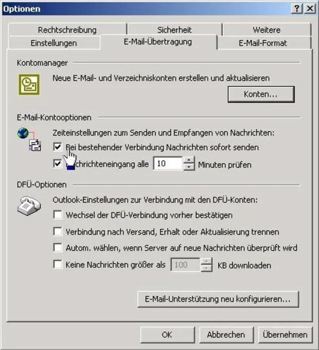 Rufen Sie auf: "Extras/Optionen.../E-Mail-Übertragung".