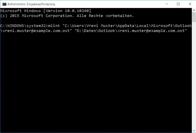 mklink "C:\Users\Vreni Muster\AppData\Local\Microsoft\Outlook\vreni.muster@example.com.ost" "D:\Daten\Outlook\vreni.muster@example.com.ost"