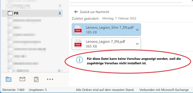 In folgenden Fällen zeigt Outlook beim Versuch, die Vorschau einer PDF-Datei anzuzeigen, diese Fehlermeldung an: «Für diese Datei kann keine Vorschau angezeigt werden, weil die zugehörige Vorschau nicht installiert ist».