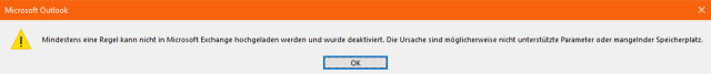 Das kann jahrelang gut gehen, während Sie eine Regel um die andere erstellen. Aber irgendwann nervt Outlook mit einer Fehlermeldung: «Mindestens eine Regel kann nicht in Microsoft Exchange hochgeladen werden und wurde deaktiviert. Die Ursache sind möglicherweise nicht unterstützte Parameter oder mangelnder Speicherplatz».