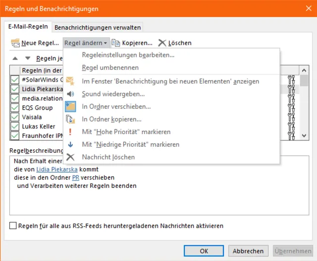 Hier lassen sich Regeln löschen, bearbeiten und auch umbenennen