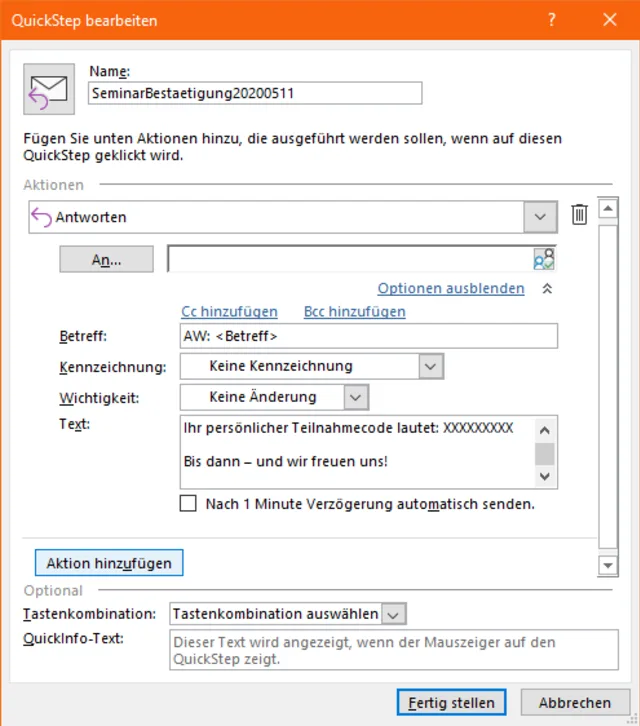 Passt alles, klicken Sie auf Fertig stellen. Um den QuickStep auf eine Nachricht anzuwenden, klicken Sie einfach mit rechts auf die Mail. Im Kontextmenü finden Sie unter QuickSteps Ihren neuen Eintrag. Klicken Sie ihn an, tut Outlook, was Sie ihm in den QuickStep-Einstellungen aufgetragen haben. Wenn das Kästchen für Nach 1 Minute Verzögerung automatisch senden aktiviert war, wird die Mail nach einer Minute sofort verschickt. War es nicht aktiv, haben Sie jetzt das Verfassen-Fenster vor sich. Hier könnten Sie beispielsweise noch den erwähnten Teilnahmecode ergänzen, anschliessend heisst es per Senden-Knopf «ab, die Post»!