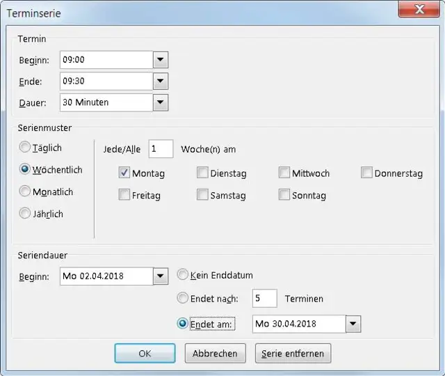 Quelle: PCtipp.chDoppelklicken Sie die Kopie, passen Sie allfällige Texte an und stellen Sie unter Optionen/Serientyp die neuen Termine ein. Wählen Sie als Startdatum das erste Datum, an dem die neuen Zeiten der Besprechnung gelten. Speichern Sie die neue Terminserie.