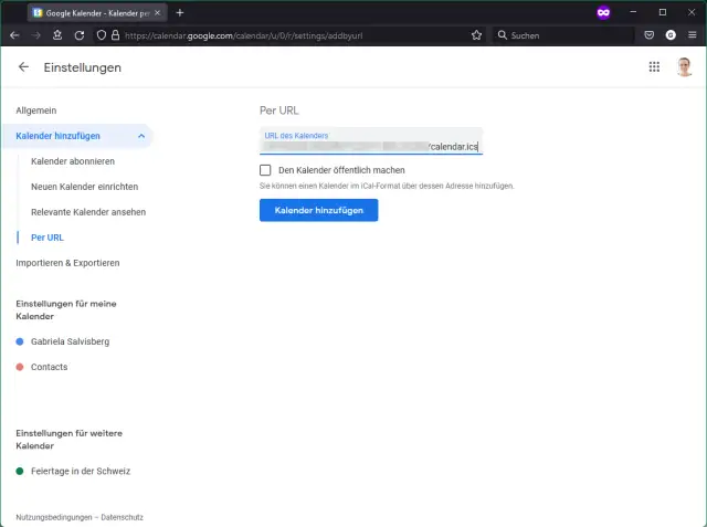 Öffnen Sie calendar.google.com und loggen Sie sich mit Ihrem Google-Konto ein. Bei Weitere Kalender klicken Sie aufs Plus-Zeichen und benutzen Per URL. Fügen Sie den vorhin aus Ihrem Office-Konto kopierten .ics-Link mittels Ctrl+V (Strg+V) ein. Klicken Sie auf Kalender hinzufügen.