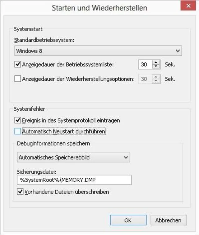 Quelle: PCtipp.chSo gehts: In den neueren Windows-Versionen wie Windows Vista, Windows 7, Windows 8 und Windows 10 gehts in die Systemsteuerung, danach zu System und Sicherheit/System/Erweiterte Systemeinstellungen. Im Reiter Erweitert treffen Sie auf Starten und Wiederherstellen. Öffnen Sie dort die Einstellungen und deaktivieren Sie die Option «Automatisch Neustart durchführen».