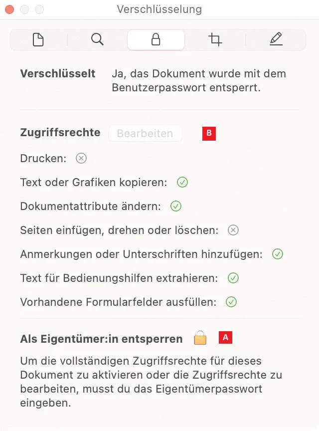 Um die Einschränkungen anzupassen, wählen Sie im Menü Ablage den Befehl Passwort eingeben. Klicken Sie auf das Schloss, Bild 2 A, geben Sie das Eigentümerpasswort ein und ändern Sie die Berechtigungen B.