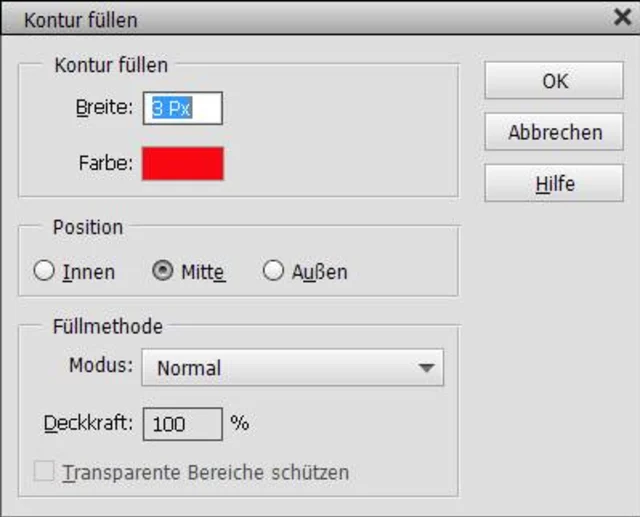 Legen Sie oben fest, wie breit der Rahmen sein soll, zum Beispiel «3 Px». Klicken Sie darunter ins Farbfeld und wählen Sie die gewünschte Farbe aus. Die «Position» bestimmt, ob Sie die drei ersten Pixelreihen innerhalb oder ausserhalb des Rahmens meinen oder ob der Rahmen sowohl Pixel inner- als auch ausserhalb enthalten soll. Das wars eigentlich schon! Die Füllmethode gibt Ihnen noch Zugriff auf ein paar Effekte.