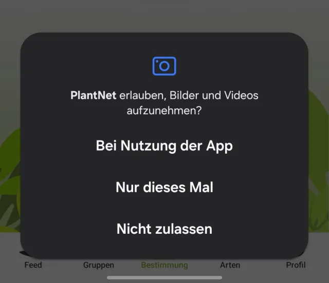 Für die Identifikation können Sie direkt die Kamera des Smartphones verwenden. Werden Sie dabei nach der Freigabe gefragt, wählen Sie, wenn möglich Nur dieses Mal aus, Bild 4. So hat die Anwendung nicht permanenten Zugriff auf Ihre Kamera.