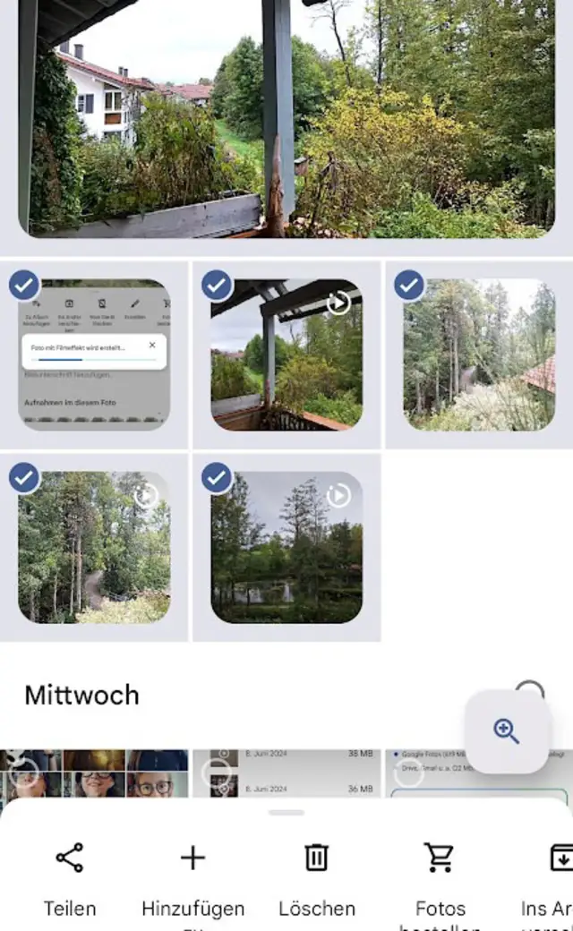 Aus Kinofilmen kennen Sie sicher den Effekt, dass die Kamera plötzlich auf eine Person oder ein Objekt zufährt beziehungsweise sich darum herumbewegt. Das wirkt spannend und dynamisch. Mit «Google Fotos» können Sie diesen Effekt leicht nachbauen. Wählen Sie ein Foto aus und öffnen Sie es in der App. Ziehen Sie es mit dem Finger leicht nach oben, bis sich der Hintergrund weiss färbt und zusätzliche Optionen erscheinen. Tippen Sie auf Erstellen und danach auf Foto mit Filmeffekt. Beim ersten Mal installiert die App den Effekt auf Ihrem Handy. Nach einem kurzen Moment wird er auf die Aufnahme angewendet und Sie können ihn betrachten. Gefällt Ihnen das erzeugte Filmchen, sichern Sie es mit Speichern.