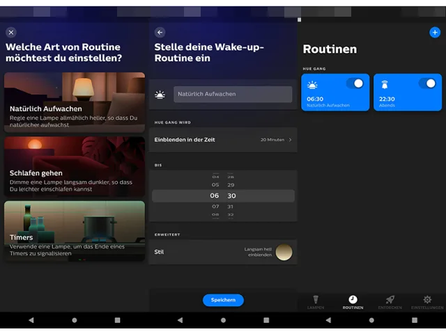 Hinweis 1: Dies wurde mit der Philips-Hue-Bluetooth-App (Version 1.36.0) und einem Android-11-Smartphone durchgeführt. Die Automatisierung «Natürlich Aufwachen» ist in der Philips Hue-App mit Verwendung der Hue Bridge unter der Registerkarte «Mit Licht Aufwachen» zu finden.