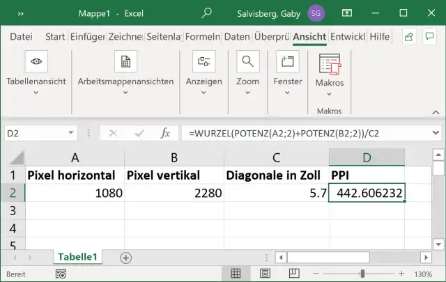 Darum führt die Wurzel aus A2+B2 zur Anzahl Pixel auf der Diagonalen. Die teilen Sie noch durch die Anzahl Zoll auf der Diagonalen, schon haben Sie die Pixeldichte. Die Formel in Excel, sofern in A2 und A3 die horizontalen und vertikalen Pixelangaben stehen und in C2 die Diagonale in Zoll: