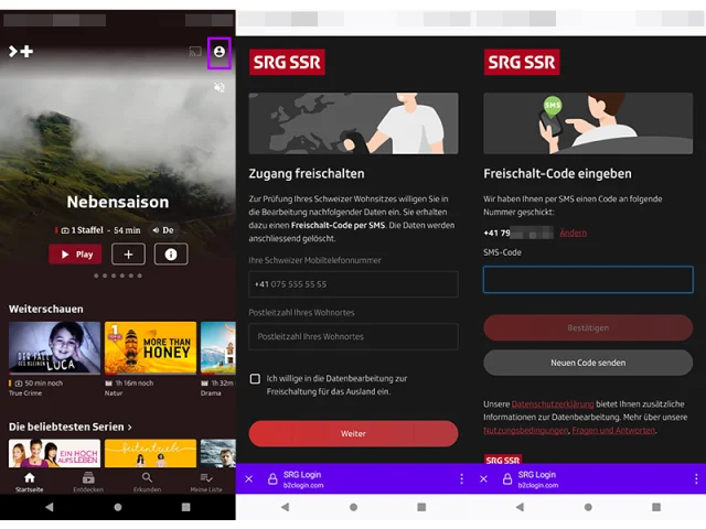 Hinweis 1: Eine Freischaltung ist nur möglich, wenn Sie über einen Schweizer Wohnsitz verfügen. Die SRG SSR verlangt zur Prüfung des Schweizer Wohnsitzes Ihre Handynummer, da Sie einen Freischalt-Code per SMS zugeschickt bekommen und Sie müssen eine Postleitzahl angeben.