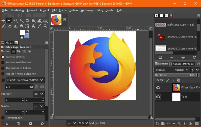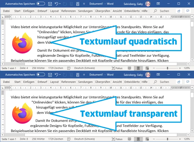 Bilddateien sind immer vier- bzw. rechteckig. Wenn ein Bild eine andere Form hat (z.B. ein rundes Icon), dann handelt es sich ebenfalls um ein viereckiges Bild, auf dem ein Gegenstand mit einem transparenten Hintergrund umgeben wurde. Die Fläche bis in die Ecken des Vierecks ist im Bild also durchaus vorhanden, wurde aber mit transparenter «Farbe» versehen. Das lässt sich in vielen Anwendungen nutzen. Hier zum Beispiel in Word. Um das obere Firefox-Logo läuft der Text quadratisch, um das untere läuft er dank der entsprechenden Einstellung eher rund, weil Word die transparenten Teile des Bildes erkennt und den Text an dieser Linie entlang führen kann.