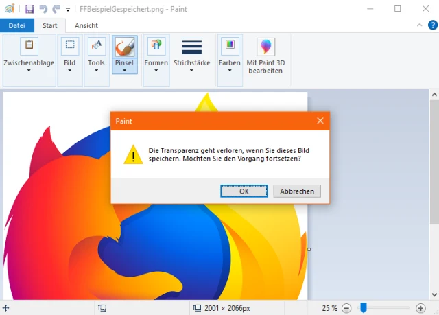 Quelle: PCtipp.ch/Wikipedia/MozillaKopieren Sie für den Versuch das Bild per Rechtsklick und Kopieren. Öffnen Sie Microsoft Paint und fügen Sie es mit Ctrl+V (Strg+V) ein. Voilà, dort erscheinen die ursprünglich transparenten Bereiche plötzlich schwarz. Und hier sind diese dann wirklich schwarz und bleiben beim Speichern schwarz; sie werden also nicht nur so angezeigt. Auch wenn Sie ein schon gespeichertes PNG-Bild mit Transparenz in Paint öffnen und erneut speichern, geht die Transparenz verloren. Die Hintergrundfarbe, die Sie in Paint sehen, ist dann jene, durch welche die Transparenz ersetzt wird. Diesmal ist es Weiss. Paint zeigt beim Speichern eine Warnung an, dass die Transparenz verlorengeht.