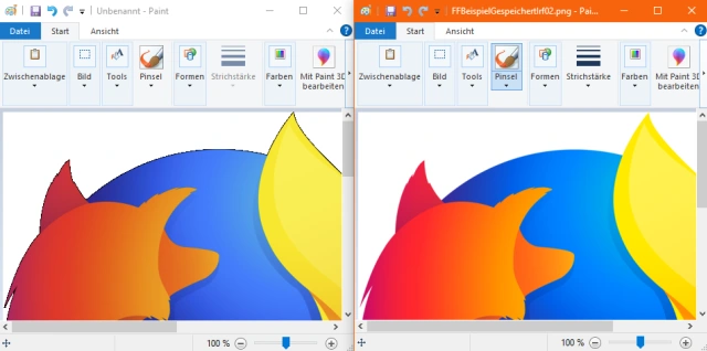 Links haben wir mit dem weissen Farb-Eimer in Paint den schwarzen Hintergrund in Weiss gefärbt. Ein hässlich verpixelter Rand bleibt übrig; ganz im Gegensatz zum rechten Exemplar, in welchem wir die Transparenz via IrfanView zu Weiss geändert haben.