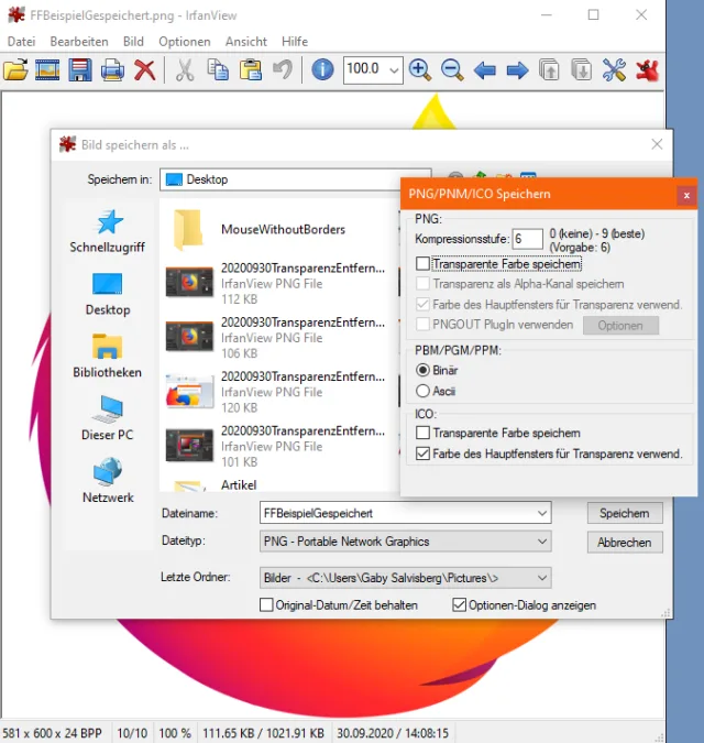 Quelle: PCtipp.ch/MozillaIn IrfanView: IrfanView kann die Transparenz durch die fürs Programmfenster eingestellte Hintergrundfarbe ersetzen – und zwar sehr sauber. Öffnen Sie in IrfanView hierfür zuerst Optionen/Einstellungen/Anzeige. Bei den Fenster-Optionen die «Farbe des Hauptfensters» wählen und dort die gewünschte Farbe aussuchen, zum Beispiel Weiss. Nun schliessen Sie das Bild und öffnen es erneut in IrfanView. Jetzt erscheint der Hintergrund Weiss. Ab jetzt geht es für alle Bilder, deren Transparenz Sie durch diese Farbe ersetzen wollen, wie folgt: Öffnen Sie das Bild in IrfanView. Gehen Sie zu Datei/Speichern unter. Aktivieren Sie ganz unten allenfalls noch Optionen-Dialog anzeigen. In diesem Dialog deaktivieren Sie Transparente Farbe speichern. Vergeben Sie noch einen passenden Dateinamen, wird das Bild anstelle von Transparenz mit der gewählten Hintergrundfarbe gespeichert.