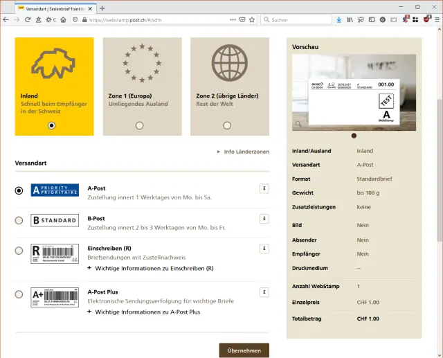 Quelle: PCtipp.chWählen Sie, ob es eine Inland- oder internationale Frankatur werden soll und bestimmen Sie darunter die Versandart, zum Beispiel A-Post. Klicken Sie unten auf Übernehmen.
