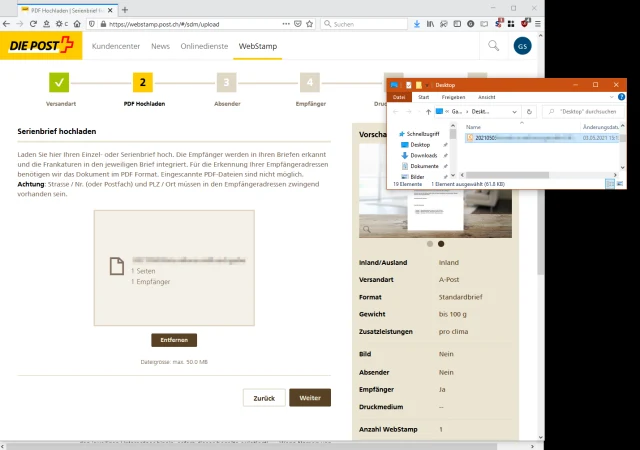 Ist die Datei nun so, wie sie sonst aus dem Drucker käme, z.B. auf Ihrem Desktop gelandet? Öffnen Sie die Datei kurz per PDF-Reader, um zu prüfen, ob der Brief korrekt aussieht. Schliessen Sie die Datei wieder. Ziehen Sie diese PDF-Datei nun direkt ins WebStamp-Browserfenster in den Bereich Brief bzw. Serienbrief hochladen.