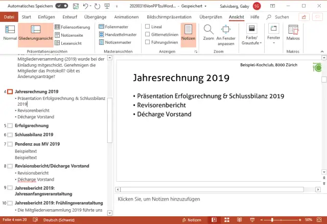 Lösung: Öffnen Sie Ihre Präsentation in PowerPoint. Gehen Sie im Reiter Ansicht im Bereich Präsentationsansichten zu Gliederungsansicht. In der linken Spalte erscheinen die Titel und die Textinhalte der einzelnen Folien. Drücken Sie dort Ctrl+A (Strg+A), um alle zu markieren, anschliessend Ctrl+C (Strg+C), um alles zu kopieren. Wechseln Sie zu Ihrem Word-Dokument und fügen Sie die Inhalte mit Ctrl+V (Strg+V) wieder ein. Jetzt können Sie dies als Grundlage Ihres schriftlichen Jahresberichts verwenden.