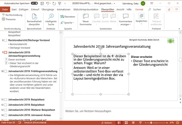 Der Plan B wird also sein: Sie fassen die Inhalte Ihres Jahresberichts in einer Word-Datei zusammen. Zum Glück können Sie die Texte aus Ihrer PowerPoint-Datei sehr einfach in ein Word-Dokument übernehmen. Dort können diese Ihnen als Gedankenstütze dienen – und Sie müssen für Ihren Jahresbericht das Rad nicht komplett neu erfinden.