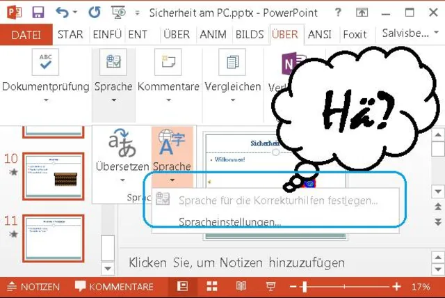 Man würde sich nun denken, es sollte so gehen: Einfach in die linke Spalte klicken, mit Ctrl+A alle Folien markieren und dann im Reiter Überprüfen via Sprache schnell die «Sprache für die Korrekturhilfen festlegen».