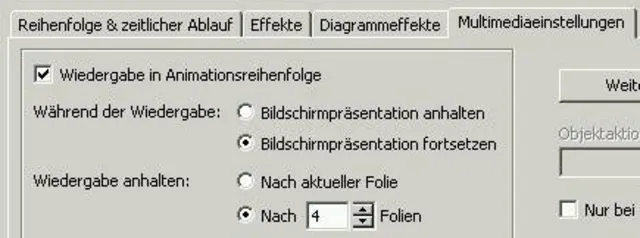 Quelle: PCtipp.chIn Version 2000 fügen Sie den Sound auf der ersten Folie ein und klicken dann mit der rechten Maustaste darauf. Im Kontextmenü wählen Sie Benutzerdefinierte Animation. Das Dialogfenster «Benutzerdefinierte Animation» hat mehrere Register; wählen Sie Multimedia (bzw. dieses Register sollte bereits angewählt sein). Im Screenshot sehen Sie, welche Einstellungen vorgenommen werden müssen, damit der Sound über mehrere Folien abgespielt wird: Unter «Während der Wiedergabe» muss angehakt sein «Bildschirmpräsentation fortsetzen». Zudem soll die Wiedergabe erst nach einer bestimmten Anzahl Folien beendet werden.