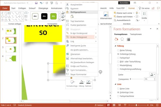 Hier hat PowerPoint eigentlich schon alles parat. Gehen Sie via Reiter Einfügen zu Formen. Es gibt eine Form mit Namen Rechteck: gefaltete Ecke. Wählen Sie diese aus und zeichnen Sie ein ungefähres Quadrat auf die Folie. Das sieht doch inkl. geknickter Ecke schon fast aus wie ein Post-it! Klicken Sie wieder mit rechts drauf und wählen Sie geeignete Füll- und Konturfarben aus.