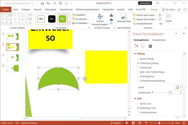 Im Reiter Einfügen schnappen Sie sich bei den Illustrationen unter den Formen ein Rechteck. Malen Sie es hin. Klicken Sie es an und wechseln Sie zum Reiter Format. Bei Fülleffekt greifen Sie zur gewünschten Farbe. Unter Formkontur können Sie eine leicht abweichende (etwas dunklere) Farbe verwenden und dieser eine dünne Strichstärke verpassen.