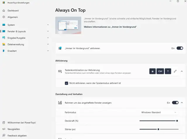 Um die Funktion ein- oder auszuschalten, klicken Sie das Fenster an, das Sie im Vordergrund halten wollen. Nun drücken Sie die Tastenkombination Windowstaste+Ctrl+T. Das ausgewählte Fenster erscheint farblich umrandet, um zu kennzeichnen, dass es im Vordergrund angeheftet ist. Auch hier können Sie die Tastenkombination in den Einstellungen nach Belieben ändern, Bild 10.