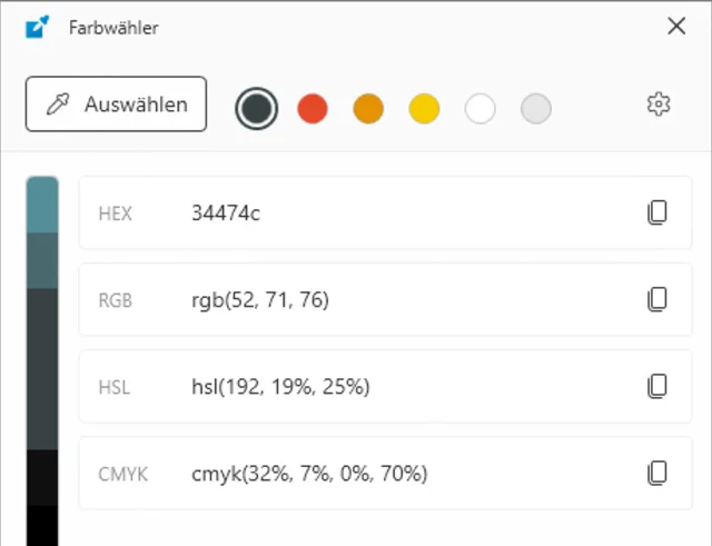 Quelle: PCtipp.chDer Farbwähler ist vorwiegend für Designer und Entwickler interessant, die mit einem Mausklick die Farbwerte einer beliebigen Bildschirmposition einfangen möchten, ähnlich der Pipettenfunktion einer Bildbearbeitungs-Software. Das Tool ermöglicht die Auswahl einer Farbe aus jeder aktuell laufenden Anwendung und kopiert automatisch die HEX-, RGB- oder CMYK-Werte in die Zwischenablage. Standardmässig führen Sie den Farbwähler mittels Windowstaste+Shift+C aus. Bewegen Sie anschliessend den Mauscursor über die gewünschte Farbe.