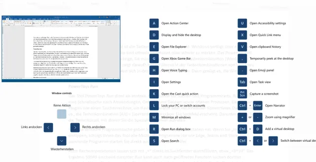 Passend zum vorherigen Tool ist die Tastenkombinationsübersicht. Die Windowstaste unterstützt eine beachtliche Zahl von Tastenkombinationen. Diese sind oft unbekannt. Dieses PowerToy hilft Ihrem Gedächtnis auf die Sprünge. Sie müssen sich lediglich die Tastenkombination Windowstaste+Shift+‹ merken. Das Tool zeigt daraufhin eine Übersicht der Tastenkombinationen von Windows an. Die Tastenkombination für dieses Tool lässt sich in den Einstellungen ändern, Bild 6.
