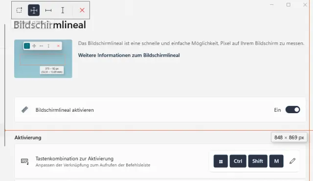 Zugegeben, diese Funktion benötigt man eher selten. Wenn doch, steht das passende Tool parat: Mit dem Bildschirmlineal lassen sich Elemente auf Ihrem Monitor in Pixel vermessen. Drücken Sie zum Aufrufen des Tools die Tasten Windowstaste+ Shift+Ctrl+M, um die Bildschirmlineal-Symbolleiste am oberen Bildschirmrand einzublenden. Diese etwas umständliche Tastenkombination lässt sich ändern. Sie können das Feld Begrenzungen auswählen und einen Begrenzungsrahmen aufziehen. Oder Sie messen die horizontalen und vertikalen Abstände einzeln oder gleichzeitig. Wählen Sie das entsprechende Symbol aus und bewegen Sie den Mauszeiger an die gewünschte Stelle, Bild 9.