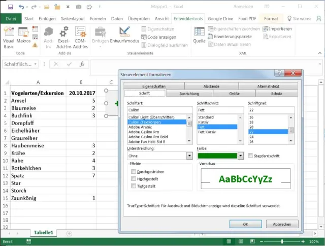 Schritt 6: Aber das geht noch etwas hübscher. Klicken Sie mit rechts auf Ihre Schaltfläche und wählen Sie Text bearbeiten. Innerhalb des Knopfes können Sie nun statt «Schaltfläche 1» einen besseren Text schreiben, zum Beispiel «1 addieren» oder schlicht «+1». Fertig? Klicken Sie nochmals mit rechts auf den Knopf und wählen Sie Steuerelement formatieren. Im Reiter Schrift wählen Sie eine beliebige Schriftfarbe und -grösse; Sie können die Schrift auch fett gestalten. Seien Sie da ruhig mutig! Klicken Sie auf OK.