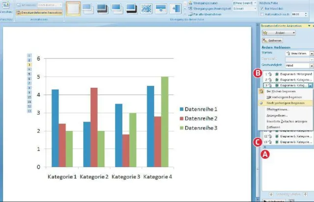 Automatische AnimationWie erwähnt blenden Sie die einzelnen Diagrammelemente in der Präsentation per Mausklick ein. Sie können die Animation aber auch automatisch ablaufen lassen. Klicken Sie in PowerPoint 2003 und 2007 in der Palette «Benutzerdefinierte Animation» auf den kleinen Doppelpfeil unter den einzelnen Animationsobjekten, um sämtliche anzuzeigen, Screen 3 A.