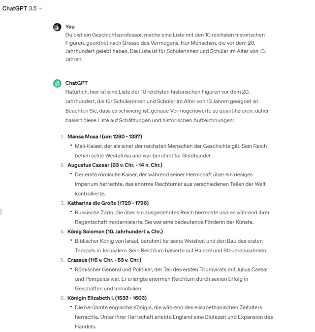 Ein etwas ausführlicher Prompt könnte zum Beispiel so aussehen: «Du bist ein Geschichtsprofessor. Mache eine Liste mit den zehn reichsten historischen Figuren, geordnet nach Grösse des Vermögens. Nur Menschen, die vor dem 20. Jahrhundert gelebt haben. Die Liste ist für Schülerinnen und Schüler im Alter von 13 Jahren gedacht.»