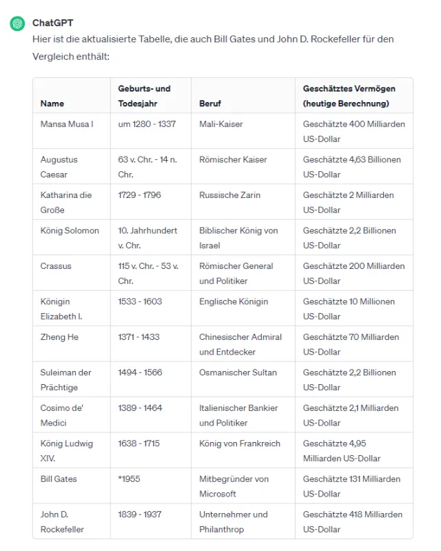 Anders als zum Beispiel bei einer Google-Suche gibt es bei ChatGPT nicht einfach ein Resultat. Was als Antwort erscheint, ist im Prinzip ein erster Wurf. Darauf können Sie eine nächste Anweisung aufbauen, zum Beispiel mit: «Erweitere die Liste um zehn Einträge», «Liste nur vermögende Frauen auf» oder «Liste nur Menschen aus Europa auf».Interessant sind aber auch die Möglichkeiten, die Antwort zu formatieren, zum Beispiel so: «Erstelle daraus eine Tabelle: in der ersten Spalte der Name, in der zweiten Geburts- und Todestag, in der dritten der Beruf.» Wenn Sie anschliessend die Tabelle betrachten, werden Sie unter Umständen feststellen, dass Sie noch mehr Informationen benötigen, zum Beispiel: «Füge eine Spalte an mit dem grob geschätzten Vermögen nach heutiger Berechnung.» Oder: «Füge zum Vergleich je eine Zeile mit den Daten von Bill Gates und John D. Rockefeller an.»